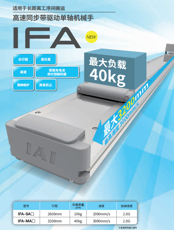 適用于長(zhǎng)距離工序間搬運(yùn) 長(zhǎng)行程 最大行程3200mm 高速 最高速度 3000mm/s 高負(fù)載 最大負(fù)載質(zhì)量 水平40kg 搭載免電池絕對(duì)型編碼器 簡(jiǎn)單維護(hù)